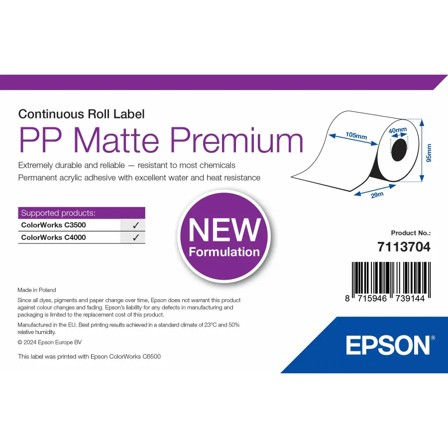 Etikettenrolle, Epson, Material: Kunststoff, PP Matte Label Premium, Beschichtung: Nein, Klebstoff: Normal, Breite: 105 mm, Höhe: 29000 mm, Durchmesser: 95 mm, Kerndurchmesser: 40 mm, Etiketten pro Rolle: 1, Abgrenzung: Kontinuierlich, Perforation: Nein, Farbe: Weiß